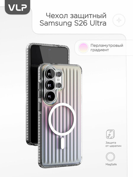 Чехол для Samsung Galaxy S26 Ultra Pulse Case с MagSafe: защита и стиль Противоударный чехол VLP Pulse Case обеспечивает надежную защиту вашего смартфона от ударов и падений благодаря усиленным краям и специальному материалу, который смягчает удары. Прозрачный материал с голографическим эффектом красиво переливается при движении, подчеркивая дизайн вашего Samsung Galaxy S26 Ultra. Магнитное кольцо позволяет легко подключать беспроводные зарядки и другие аксессуары MagSafe, что делает использование смартфона еще более удобным и практичным. Совместимость с Samsung S26 Ultra Выбирайте перламутровый чехол для Samsung Galaxy S26 Ultra Pulse Case с MagSafe и наслаждайтесь надежной защитой и стильным дизайном вашего смартфона.
