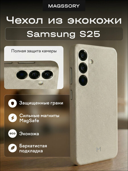 CLT040ivory Чехол Magssory для Samsung Galaxy S25, экокожа, с магнитами Чехол Magssory для Samsung Galaxy S25 CLT040 ivory из премиальной экокожи — это высокотехнологичный аксессуар, объединяющий надёжную защиту, эргономичный дизайн и передовые решения для пользователей, ценящих качество и стиль. Доступный в нескольких цветовых вариантах, чехол становится не просто защитой, а органичным продолжением вашего смартфона, подчёркивая его эстетику и обеспечивая комфорт в ежедневном использовании. В основе конструкции — высококачественная силиконовая эко‑кожа премиум‑класса, которая сочетает приятную на ощупь текстуру с исключительной износостойкостью. Материал устойчив к повседневному износу, сохраняет первоначальный вид и форму даже при интенсивной эксплуатации, а также приятно ложится в руку, обеспечивая уверенный хват. Защита устройства реализована на максимальном уровне: точные вырезы под камеру и все функциональные элементы гарантируют полный доступ к возможностям смартфона без ограничений; приподнятые боковые грани создают дополнительный барьер, предотвращая прямой контакт экрана с поверхностями при падениях и снижая риск повреждений; внутренняя подкладка из мягкой микрофибры бережно оберегает корпус от микроцарапин, сохраняя первозданный внешний вид. Особого внимания заслуживают детали премиального исполнения: рамка камеры и кнопки изготовлены из анодированного алюминия, который не только идеально сочетается по цвету с основным материалом чехла, но и обеспечивает чёткий, приятный тактильный отклик при нажатии. Такое сочетание материалов подчёркивает статус аксессуара и добавляет ему изысканности. Важнейшее преимущество модели — интеграция мощных неодимовых магнитов класса N52, обеспечивающих полную совместимость с экосистемой MagSafe. Благодаря этому вы можете: без ограничений использовать беспроводные зарядные устройства; надёжно фиксировать смартфон на магнитных держателях; подключать любые аксессуары MagSafe, не снимая чехол. Бренд Magssory, будучи участником проекта «Сделано в Москве», подтверждает свою приверженность высоким стандартам качества и инновационному подходу к разработке аксессуаров. Этот чехол — не просто функциональный аксессуар, но и стильный элемент, способный подчеркнуть индивидуальность владельца. Он станет отличным подарком для близких людей: любимой девушки, парня, мамы, папы или коллеги. Такой презент продемонстрирует ваше внимание к деталям и стремление сделать жизнь получателя удобнее и технологичнее. Независимо от повода — будь то день рождения, юбилей или просто знак внимания — чехол Magssory будет уместным и ценным подарком. Обеспечьте своему телефону надёжную защиту с изысканным стилем — выберите чехол Magssory уже сегодня и оцените преимущества премиального качества в каждой детали!
