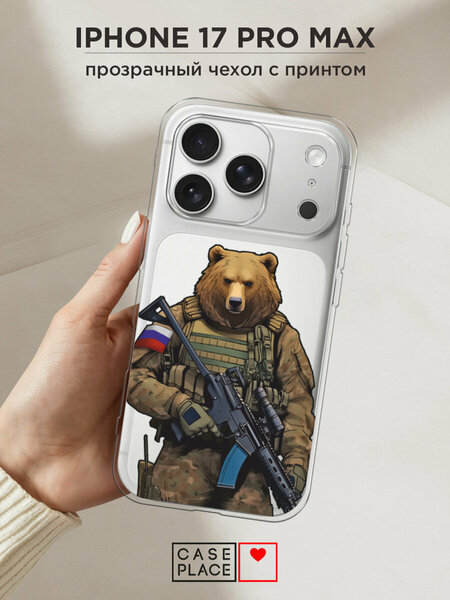 Чехол на Apple iPhone 17 Pro Max / Айфон 17 Про Макс с принтом Медведь с автоматом, прозрачный
