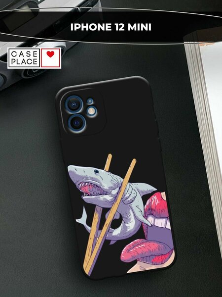 Черный матовый чехол на Apple iPhone 12 mini / Айфон 12 Мини с принтом "Акула суши арт"