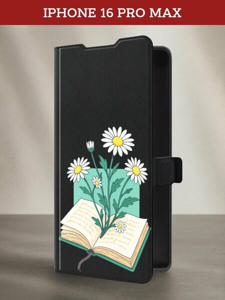 Чехол-книжка на Apple iPhone 16 Pro Max / Айфон 16 Про Макс с принтом Книжный цветок, черный