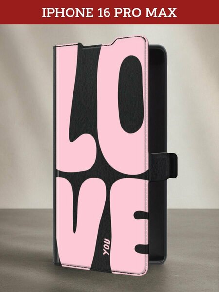 Чехол-книжка на Apple iPhone 16 Pro Max / Айфон 16 Про Макс с принтом LO VE, черный