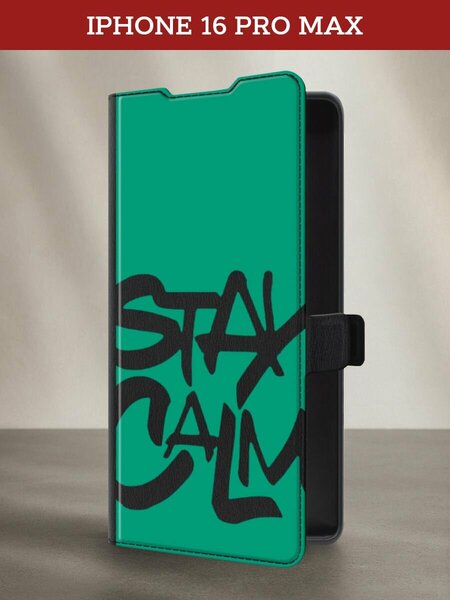 Чехол-книжка на Apple iPhone 16 Pro Max / Айфон 16 Про Макс с принтом Stay Calm green, черный