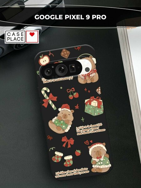 Черный матовый чехол на Google Pixel 9 Pro / Гугл Пиксель 9 Про с принтом "Капибара перед рождеством"