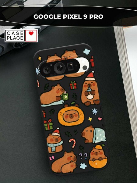 Черный матовый чехол на Google Pixel 9 Pro / Гугл Пиксель 9 Про с принтом "Капибары зимуют 2"