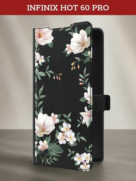 Чехол-книжка на Infinix Hot 60 Pro Plus / Инфиникс Хот 60 Про Плюс с рисунком Beautiful white flowers, черный