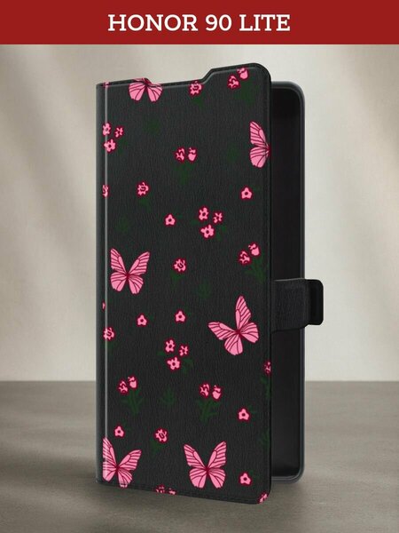 Чехол-книжка на Honor 90 Lite / Хонор 90 Лайт с принтом Паттерн бабочки и цветы, черный
