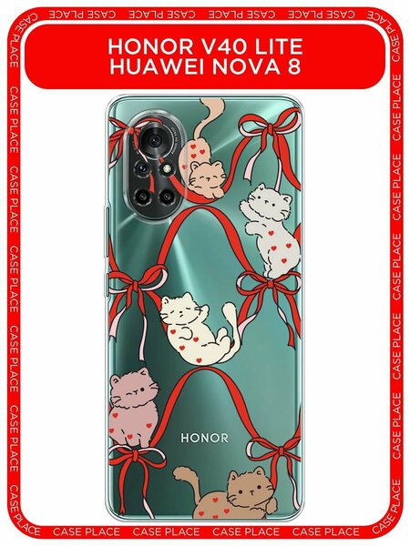 Чехол на Honor V40 Lite/Huawei Nova 8 / Хонор В40 Лайт/Хуавей Нова 8 с принтом "Котики в ленточках 2", прозрачный