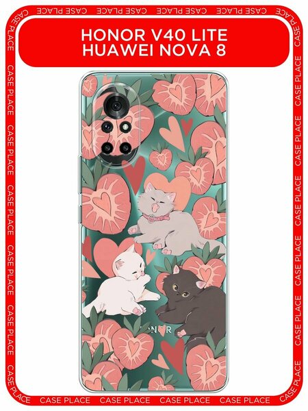 Чехол на Honor V40 Lite/Huawei Nova 8 / Хонор В40 Лайт/Хуавей Нова 8 с принтом "Клубничные котики", прозрачный