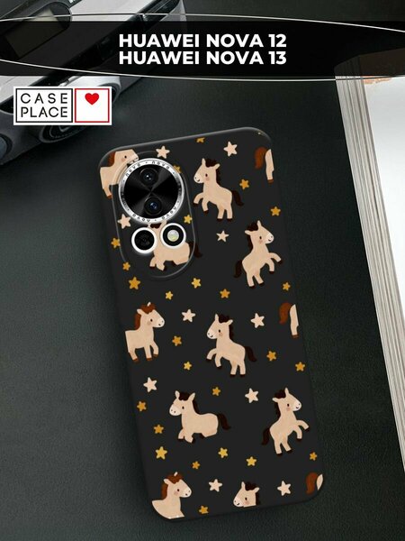 Черный матовый чехол на Huawei Nova 12/Nova13 / Хуавей Нова 12/Нова 13 с принтом "Лошадки и звездочки паттерн 2"