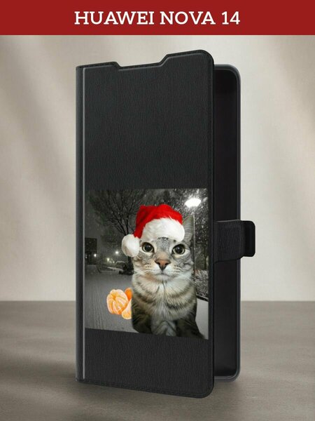 Чехол-книжка на Huawei Nova 14 / Хуавей Нова 14 с принтом Кот с мандаринами зимой, черный