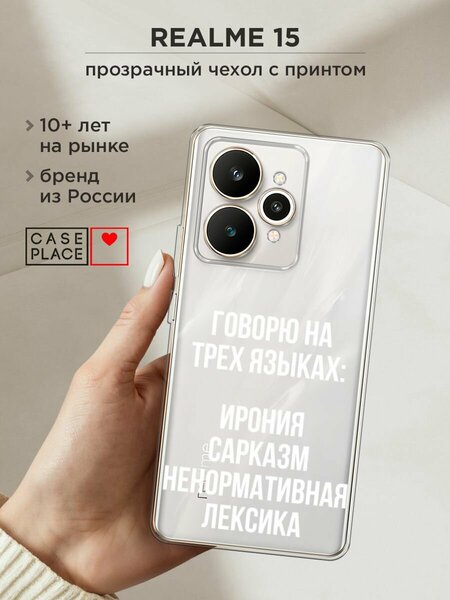 Силиконовый чехол из приятного на ощупь материала с сочным УФ-принтом – порадует и оставит яркие впечатления. Чехол помогает защитить Realme 15 от царапин, загрязнений и при падениях с небольшой высоты. Накладка не скользит в руках. Она тонкая и легкая – девайс не становится больше, поэтому им так удобно пользоваться. Для надежной защиты модуля камер от повреждений есть бортик: если смартфон упадет на заднюю крышку, этот бортик не даст видеоблоку удариться о поверхность, приняв удар на себя. Специальные точки внутри чехла не дают ему прилипать к корпусу устройства. Технологические вырезы выполнены с высокой точностью, поэтому все порты и кнопки Реалми 15 остаются доступными. Мы наносим изображения на собственном японском оборудовании гибкими чернилами, поэтому принт "Мои языковые способности" не царапается монетами, ключами и песчинками, не затирается и не трескается при повседневных деформациях. Пигмент застывает под действием УФ-излучения, образуя защитную пленку. Положение принта подобрано таким образом, чтобы гармонично смотреться относительно блока камер. Формат рисунка – 2D: боковые стороны остаются прозрачными.