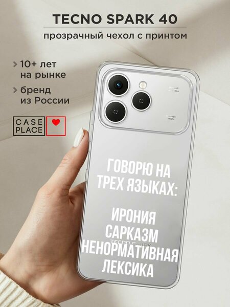 Силиконовый чехол из приятного на ощупь материала с сочным УФ-принтом – порадует и оставит яркие впечатления. Чехол помогает защитить Tecno Spark 40 от царапин, загрязнений и при падениях с небольшой высоты. Чехол защищает от любых повреждений. Накладка не скользит. Она тонкая и легкая – девайс в ней не становится больше, поэтому им так удобно пользоваться. Для надежной защиты модуля камер от повреждений есть бортик: если смартфон упадет на заднюю крышку, этот бортик не даст видеоблоку удариться о поверхность, приняв удар. Специальные точки внутри чехла не дают ему прилипать к корпусу устройства. Технологические вырезы выполнены с высокой точностью, поэтому все порты и кнопки Текно Спарк 40 остаются доступными. Мы наносим изображения на собственном японском оборудовании гибкими чернилами, поэтому принт "Мои языковые способности" не царапается монетами, ключами и песчинками, не затирается и не трескается при повседневных деформациях. Пигмент застывает под действием УФ-излучения, образуя защитную пленку. Положение принта подобрано таким образом, чтобы гармонично смотреться относительно блока камер. Формат рисунка – 2D: боковые стороны остаются прозрачными.