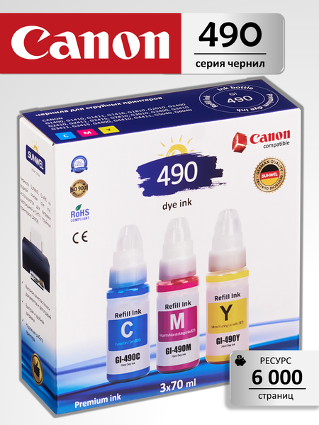Водорастворимые чернила 490 для струйных принтеров CANON PIXMA. Чернила canon pixma подходят для заправки оригинальных и совместимых картриджей, системы непрерывной подачи чернил (СНПЧ), перенаправляемых картриджей (ПЗК). В наборе 3 флакона: голубой – 70 мл, желтый – 70 мл, пурпурный – 70 мл. Ресурс печати 6000 страниц А4 при заполнении краской 5%. Краска для принтера canon GI-490 / GI-890 гарантирует отличное качество печати на документах и фотобумаге. Краски для принтера canon 490 подходят к следующим моделям струйного принтера CANON PIXMA G1400, G1410, G1411, G1416, G1810, G2010, G2400, G2410, G2411, G2415, G2810, G3010, G3400, G3410, G3411, G3415, G4400, G4410, G4411, G5040, G6040. Совместимые принтеры кэнон для европейской региона: G1500, G1501, G1510, G2500, G2501, G2510, G3500, G3501, G3510, G4500, G4510, G4511, G1500, G1501, G1510, G2500, G2501, G2510, G3500, G3501, G3510, G4500, G4510, G4511. Совместимые принтеры кенон для других регионов: G1000, G1010, G1100, G1110, G1200, G1800, G1900, G1910, G2000, G2010, G2020, G2100, G2110, G2200, G2800, G2810, G2810, G2900, G2910, G3000, G3010, G3020, G3100, G3110, G3200, G3800, G3810, G3900, G3910, G4000, G4010, G4100, G4110, G4200, G4210, G4800, G4810, G4900, G4910. Чернила в принтер canon обладают отличной цветопередачей и безопасностью для эксплуатации принтера канон. Краска на canon pixma обеспечивает высокое качества печати, обладает высокой стойкостью к выцветанию и не вызывает проблем с печатью. Совместимые чернила для canon pixma стоят значительно дешевле аналогичных картриджей, при этом чернил в контейнерах больше, чем в картриджах. Печатайте до 3-х лет без покупки расходных материалов. Водорастворимая краска на принтер canon очищена методом многоуровневой фильтрации. Состав: вода, краситель, регуляторы вязкости и текучести. При соприкосновении с бумагой чернила canon pixma мгновенно впитываются. Улучшенная формула чернил способствует продлению срока службы принтера. Краска для canon pixma 490 прошла контроль качества и сертификацию ISO 9001, REACH, RoHS и СЕ. Срок хранения контейнеров составляет 5 лет. Каждый флакон имеет вакуумную упаковку. После открытия рекомендуется хранить контейнер в вертикальном положении и использовать в течение 6 месяцев. Чернила canon gi-490 можно доливать и смешивать с остатком оригинальных чернил canon pixma. Если вы ищете качественные canon чернила для принтера, то краска для принтера canon pixma SUNWEL 490 отличный выбор. Сanon краска для принтера обеспечивает высокое качество печати, безопасность и долговечность, а их удобство использования и доступная цена делают их идеальным выбором для всех пользователей принтеров Canon. Краска в принтер SUNWEL 490 - оптимальный выбор для надежной работы принтера CANON и качественной печати.