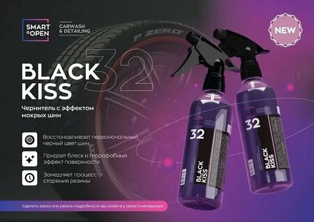 Чернитель с эффектом мокрых шин SMART BLACK KISS 32, 0.5 л Премиальный уход за шинами и резиновыми элементами автомобиля! SMART BLACK KISS 32 — это высокоэффективное средство для восстановления черноты и блеска шин с эффектом "мокрого покрытия". Придаёт шинам насыщенный глубокий цвет, при этом защищая их от пересыхания, выцветания и негативного воздействия внешней среды. Основные характеристики: ✅ Объем: 0,5 л ✅ Форма выпуска: спрей ✅ Эффект: глубокий чёрный цвет с мокрым блеском ✅ Применение: шины, резиновые уплотнители, коврики ✅ Быстро сохнет и не оставляет жирных следов Преимущества: ✔ Обновляет внешний вид шин и резиновых элементов ✔ Обеспечивает стойкий эффект и защиту от УФ-лучей ✔ Лёгкость нанесения — распылить и равномерно распределить ✔ Подходит для профессионального и домашнего использования Как использовать: 1 Тщательно очистите поверхность от грязи и пыли. 2 Нанесите средство на сухую поверхность с помощью распылителя. 3 Равномерно распределите мягкой губкой или салфеткой. 4 Дайте средству полностью высохнуть. Условия хранения: ✔ Хранить при температуре от +5 до +30 °C. ✔ Беречь от прямых солнечных лучей и источников тепла.