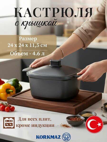 Чугунная кастрюля Korkmaz Casterra Размер 24x24x11,5 см / 4,6 л. - Экологичный материал — чугун обеспечивает равномерный нагрев и сохраняет тепло, идеально подходя для медленной готовки. Покрытие с PTFE, устойчива к повреждениям и царапинам. - Универсальная совместимость — подходит для всех типов плит, включая газовые, электрические , стеклокерамические (кроме индукции). - Практичная комплектация — включает жаропрочную крышку и ненагревающиеся ручки для комфортной и безопасной эксплуатации. - Оптимальный объем — рассчитан на приготовление крупных порций, удобен для семейного использования. - Модный дизайн — черный матовый цвет дополняет интерьер кухни и подчеркивает стиль современной посуды.
