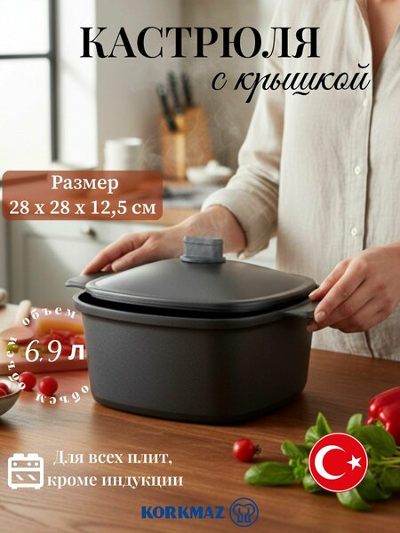 Чугунная кастрюля Korkmaz Casterra идеально сочетает надежность и функциональность благодаря высокому качеству материала. Подходит для любых видов плит , кроме индукции– от газовой до инфракрасной – обеспечивает равномерный нагрев и долгий срок службы. Размер: 28x28x12,5 см Комплектация включает жаропрочные ненагревающиеся ручки и плотную крышку, которая сохраняет тепло и аромат блюд. Емкостью около 6,9 литров она легко справится с приготовлением мяса или овощей даже для большой семьи. Покрытие с PTFE, устойчива к повреждениям и царапинам. Черный матовый дизайн дополняет интерьер любой кухни.