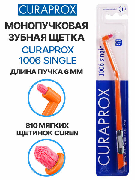 CURAPROX 1006 Single & Sulcular - монопучковая зубная щетка. Эта щетка с ультратонкими щетинками CUREN длиной 6 мм идеально подходит для индивидуальной чистки каждого зуба и десневых бороздок. Круглая форма кисточки и нежные щетинки обеспечивают превосходную адаптацию к анатомии линии десны, не оказывая никакого давления! Прекрасно очищает основные места скопления зубного налёта - межзубные промежутки, десневые бороздки. Щетка идет в комплекте с защитным чехлом. Щетина CUREN изготовлена из полиэстра, в отличие от обычных зубных щеток, которые сделаны полностью из нейлона. Водопоглащаемость полиэстра в шесть раз ниже, поэтому даже во влажном состоянии щетинки CUREN сохраняют первоначальную упругость и пластичность. Это обеспечивает мягкую и глубокую чистку.