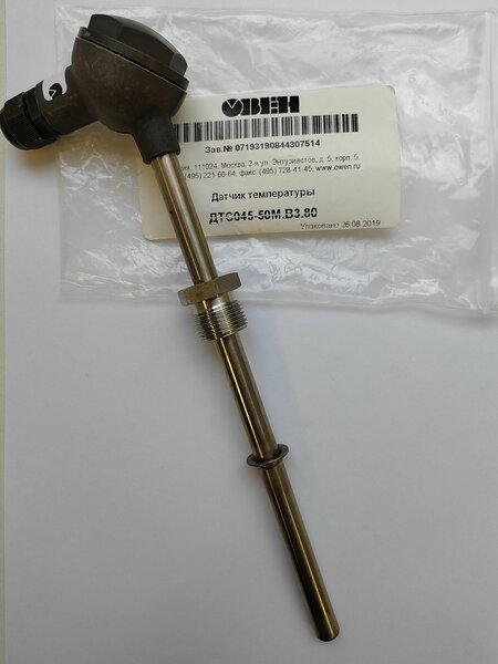 Внимание! Датчики 2019-2021 года! Термометр сопротивления овен ДТС045-50М. В3.80 является датчиком температуры и предназначен для непрерывного измерения температуры различных сред и работает совместно с приборами, имеющими вход под термосопротивления. Материал корпуса: нержавеющая сталь 12Х18Н10Т Длина погружной части L: 80 мм Резьба штуцера: М20х1.5 Диапазон измеряемых температур: -50.+180 град С Условное давление: 10 МПа (100 кгс/см2) Диаметр датчика D: 10 мм Исполнение коммутационной головки: пластмасса Номинальная статическая характеристика НСХ: 50М Класс допуска: В Схема внутренних соединений проводников: 3 - трехпроводная Степень защиты: IP54