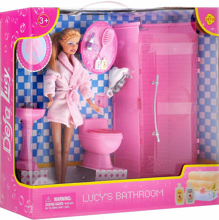 Игровой набор представлен предметами для ванной комнаты, которые подходят для куколки ростом 29 сантиметров. Очаровательная Lucy накинула розовый халатик и решила принять душ. Девочки смогут дополнить данными предметами кукольный домик, и тогда можно будет придумать ещё больше интересных сюжетных линий для игры. В комплекте находится расчёска и фен, а волосы куколки можно причёсывать, создавая оригинальные причёски. Особенности: Игровой набор представлен душевой кабиной, куколкой и многочисленными аксессуарами для ванной комнаты. Замечательная кукла Lucy высотой 29 сантиметров создана в образе молодой девушки, которая решила принять водные процедуры. Кукла имеет приятную внешность с аккуратными чертами лица. Лёгкий макияж придаёт глазам и губам куклы особенную выразительность. Блестящие длинные волосы блондинки можно расчесать и собрать в хвост, чтобы они не мешали принимать душ. Душевая кабина выполнена в реалистичной манере и подходит под рост куклы. В комплекте есть раковина и унитаз и также расчёска и фен, чтобы после душа привести в порядок красивые волосы куклы. Моделирование новых причёсок развивает творческую фантазию и воображение ребёнка, а также моторику рук. Кукла снабжена подвижными шарнирными соединениями в области плеч и бёдер. Куколка одета в короткий розовый халатик, среди многочисленных аксессуаров есть полотенце и косметические средства, которые позволят ухаживать за куколкой. Набор станет прекрасным дополнением кукольного домика. С помощью данной куклы девочки смогут придумать интересные сценарии для сюжетно-ролевой игры. Набор выполнен из качественного нетоксичного пластика и текстиля, поэтому не принесёт вреда здоровью ребёнка. Примечание: Цветовое исполнение элементов набора может отличаться от представленных на фото. Параметры: Комплект: кукла, душевая кабинка, унитаз, раковина, расчёска, фен, 2 флакона. Возраст: от 3 лет. Состав: пластик, текстиль. Высота куклы: 29 см. Размер упаковки: 37 х 11 х 34,5 см. Упаковка: картонная коробка блистерного типа. Производитель: Defa Lucy.