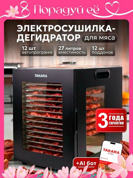 Дегидратор TAKARA DF-15 — это мощный и вместительный дегидратор, который позволит легко заготавливать полезные продукты без консервантов и лишней влаги. Современный дизайн в красно-черных тонах делает его не только функциональным устройством, но и стильным элементом кухни. С дегидратором TAKARA DF-15 можно приготовить: Сушеные фрукты и овощи – яблоки, бананы, груши, томаты, морковь, грибы Домашняя пастила – натуральные фруктовые пюре без сахара Мясные и рыбные снеки – вяленая говядина (джерки), рыба, курица Травы и специи – мята, базилик, орегано Сухофрукты для компотов и чаев – ягоды, цитрусовые, травы Орехи и семечки – равномерная сушка без перегрева Домашний йогурт – низкотемпературная ферментация Лакомства для домашних животных – натуральные сушеные мясные кусочки. Преимущества дегидратора TAKARA DF-15