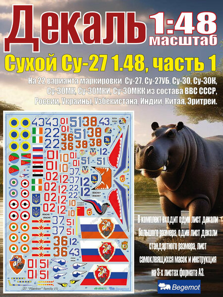 Деколь на 22 варианта маркировки С у-27, С у-27УБ, С у-30, С у-30К, С у-30МК, С у-30МКИ, С у-30МКК из состава ВВС СССР, России, Украины, Узбекистана, Индии, Китая, Эритреи. В комплект входит один лист декали большого размера, один лист деколи стандартного размера, лист самоклеящихся масок и инструкция на 3-х листах формата А3.
