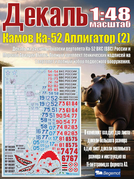 Деколь на 54 схемы окраски вертолета К а-52 ВКС (ВВС) России и Морской Авиации Египта. Полный комплект технических надписей на 1 вертолет и полный набор подвесного вооружения. В комплект входит два листа деколи большого размера, один лист деколи маленького размера и инструкция на 11-ти страницах формата А3.