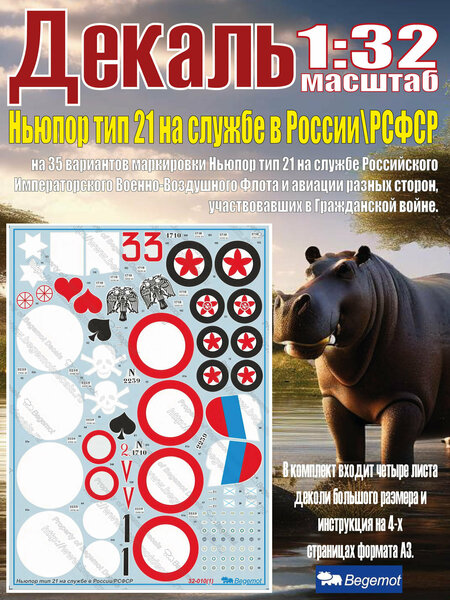 Деколь на 35 вариантов маркировки Ньюпор тип 21 на службе Российского Императорского Военно-Воздушного Флота и авиации разных сторон, участвовавших в Гражданской войне. В комплект входит четыре листа деколи большого размера и инструкция на 4-х страницах формата А3