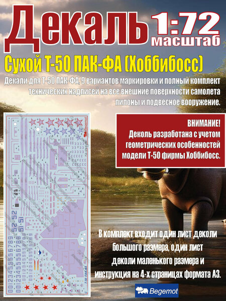 Деколи для Т-50 ПА К-ФА, 9 вариантов маркировки и полный комплект технических надписей на все внешние поверхности самолета, пилоны и подвесное вооружение. Внимание! Деколь разработана с учетом геометрических особенностей модели Т-50 фирмы Хоббибосс. В комплект входит один лист деколи большого размера, один лист деколи маленького размера и инструкция на 4-х страницах формата А3.