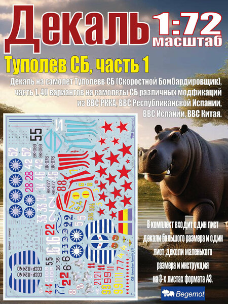 Деколь на самолет Т уполе в СБ (Скоростной Бомбардировщик), часть 1. 40 вариантов на самолеты СБ различных модификаций из ВВС РККА, ВВС Республиканской Испании, ВВС Испании, ВВС Китая. В деколь входит набор маркировки на полный комплект бомб ФАБ, использовавшихся на СБ. В комплект входит один лист декали большого размера и один лист деколи маленького размера и инструкция на 3-х листах формата А3.