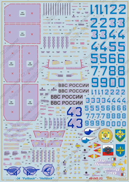 Деколь на все известные самолеты Су-34: прототип + все варианты окраски и маркировки серийных самолетов из состава ВКС России, включая Су-34 из состава Авиационной группы ВКС России в Сирии c маркировками боевых миссий. Полный комплект технических надписей на самолет и подвесное вооружение. В комплект входит четыре листа декали большого размера, два листа деколи маленького размера и инструкция на 8-ми страницах формата А3 и одной странице формата А4.