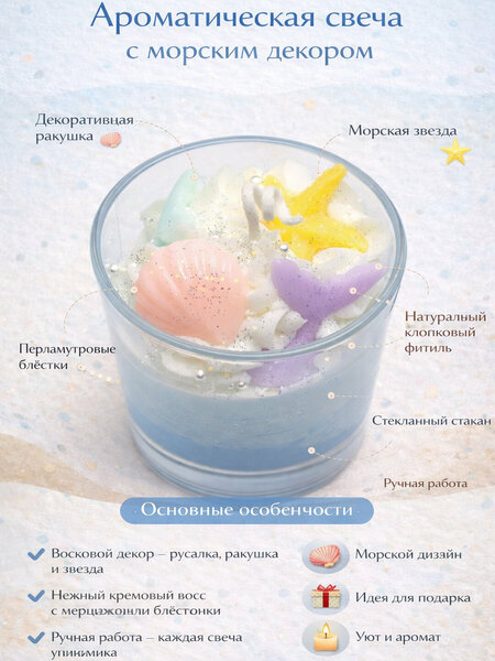 Ароматическая декоративная свеча ручной работы — это стильный элемент интерьера и уютный подарок для любого повода. Каждая свеча выполнена вручную и украшена объёмным декоративным верхом с тематическими восковыми элементами: десертными, ягодными, шоколадными, медовыми или морскими мотивами. Свеча залита в прозрачный стеклянный стакан и дополнена натуральным хлопковым фитилём. Мягкий кремовый воск и продуманный дизайн создают атмосферу уюта, тепла и эстетического удовольствия. Каждое изделие уникально — возможны незначительные отличия в форме и оттенках, что подчёркивает ручную работу. Свеча идеально подойдёт для декора интерьера, фотосъёмки, подарка близким или создания расслабляющей атмосферы дома. ⭐ Преимущества ✔ Ручная работа — каждая свеча уникальна ✔ Декоративный дизайн с объёмными восковыми элементами ✔ Стеклянный стакан — аккуратный и универсальный формат ✔ Натуральный хлопковый фитиль ✔ Подходит для подарка и интерьерного декора Применение для уюта и атмосферы дома для декора интерьера для подарка для фотоконтента и оформления пространства ℹ Важно Свеча является декоративной, перед использованием рекомендуется удалить крупные декоративные элементы. Не оставляйте горящую свечу без присмотра. Используйте на ровной, термостойкой поверхности. Короткий вариант (для маркетплейсов) Ароматическая декоративная свеча ручной работы в стеклянном стакане. Объёмный десертный/тематический дизайн, хлопковый фитиль, подходит для декора интерьера и подарка