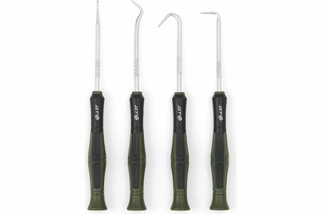 Набор универсальных крючков и зацеповДело Техники 829024 предназначен для демонтажа уплотнительных колец, шайб и сальников, прочистки отверстий, извлечения мелких деталей и прочих работ, требующих применение миниатюрного инструмента. Длина инструмента: 170-175 мм Длина жала: 70-75 мм Твёрдость 40 HRC. Тип: крючки. Высота: 175 мм. Количество крюков: 3 шт. Тип упаковки: блистер. Количество шил: 1 шт. Класс товара: Профессиональный. Комплектация: Полукруглый крюк, Крюк 120° , Крюк 90°, Шило, Упаковка.