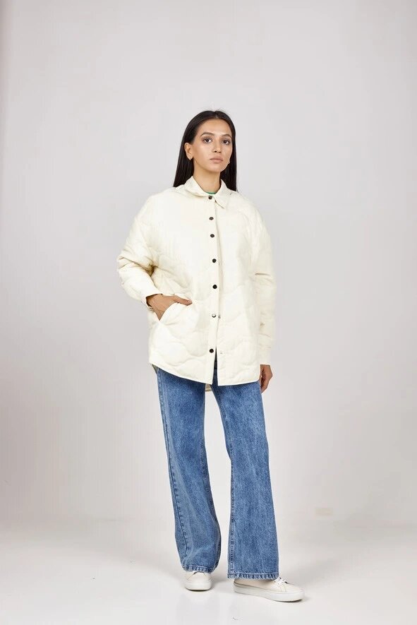 Стеганая куртка свободного силуэта без капюшона с отложным воротником. Застегивается на ряд металлических кнопок. Также дополнена двумя прорезными карманами. Отлично подойдет для осени и прохладной весны.
