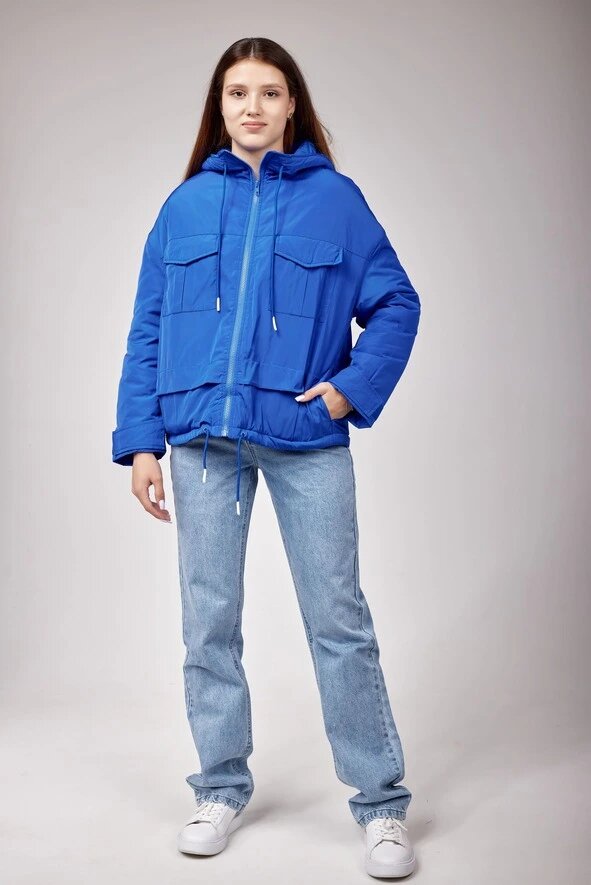 Демисезонная куртка свободного кроя с капюшоном. Имеет два накладных кармана с клапанами, липучки на манжетах и шнурки утяжки на капюшоне и по низу модели.