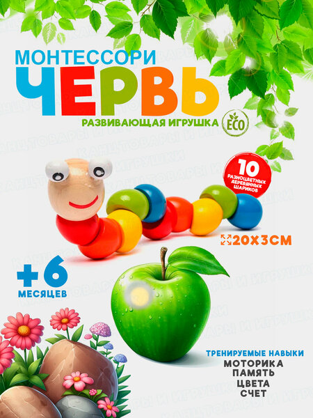 Червячок деревянный игрушка для детей, монтессори игрушка, для развития моторики и воображения