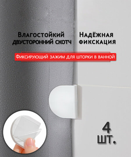 Комплект состоит из 4 штук. Фиксатор - держатель для штор и занавески в ванную обеспечивает удобное и надежное крепление шторки, обеспечивая максимальную защиту от брызг и воды. Так же подхват для штор может применяться для занавесок в спальне, детской комнате. Фиксирующий зажим для шторки в ванной крепится без сверления к стене на двусторонний влагостойкий скотч. Настенный зажим для штор удобен и прост в использовании. Благодаря уникальному дизайну и качественным материалам, самоклеящийся зажим для занавесок легко справляется с любыми размерами и типами шторок. порядок установки Данный товар не подходит для монтажа на окрашенные стены, обои и неровные поверхности! 1: Место установки необходимо обезжирить. 2: Из-за перепада температур при транспортировке, клей может потерять свою изначальную консистенцию, поэтому рекомендуем погреть феном клеевую основу не снимая защитную пленку. 3: Снимаем защитную пленку и прикрепляем к месту установки. 4: После приклеивания держателя его необходимо сильно прижать к стене. 5: Отпускаем и оставляем минимум на 24 часа. Так фиксация будет более надежной.