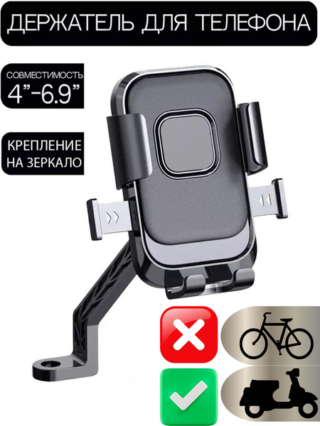 Ushbu universal telefon ushlagichi skuter va mototsikllar uchun mo‘ljallangan bo‘lib, orqa ko‘rish ko‘zgusiga o‘rnatiladi. Yo‘l davomida navigator yoki qo‘ng‘iroqlardan xavfsiz foydalanish imkonini beradi. Mustahkam mahkamlash mexanizmi tufayli telefon harakat vaqtida siljimaydi va tushib ketmaydi. Ushlagich turli o‘lchamdagi smartfonlarga mos bo‘lib, maksimal 6.9–7.0 dyuymgacha bo‘lgan telefonlarni ushlab turadi. Keng ochiluvchi mexanizm katta telefonlar va qalin chexollar bilan ham foydalanish imkonini beradi. 360° aylanuvchi bosh qismi telefonni qulay burchakda joylashtirishga yordam beradi. Metall va mustahkam plastik materiallardan tayyorlangan bo‘lib, uzoq muddat xizmat qiladi. Skuter, mototsikl va boshqa ikki g‘ildirakli transport vositalari uchun mos.