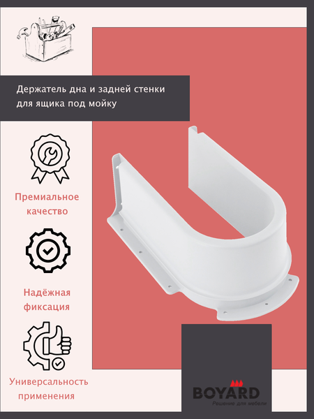 Держатель дна и задней стенки для выдвижного ящика под мойку. Предназначен для изготовления ящика под мойку. Держатель фиксирует дно и заднюю стенку выдвижного ящика, формируя глубокий удобный и эргономичный выдвижной ящик вокруг смесителя под мойкой. Высота держателя соответствует высоте металлической боковины стандартного ящика. Держатель дна и задней стенки ящика под мойку сделан из прочного и безопасного пластика, что актуально в условиях повышенной влажности пространства под мойкой. Держатель предложен в нейтральном белом цвете, который отлично сочетается с другими частями выдвижного ящика вокруг мойки.