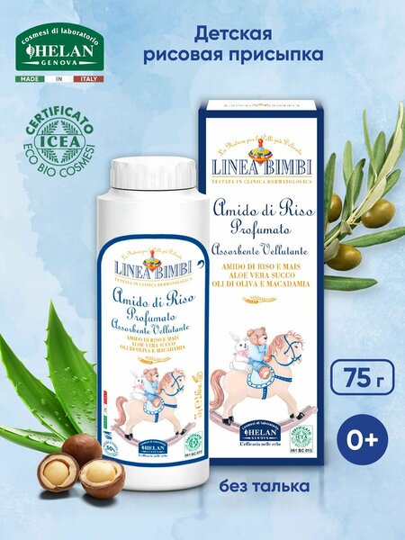 Детская органическая присыпка Helan Linea Bimbi (75г) - это натуральный и безопасный продукт для деликатного ухода за кожей новорожденных. Крахмал – главный компонент рисовых зерен – в размельченном виде оказывает на кожу малыша приятное освежающее и смягчающее действие. Присыпка разглаживает кожу, предотвращает появление опрелостей в местах пеленания новорожденных. Сохраняет кожу сухой. Сок алоэ вера, масло оливы и ореха способствуют дополнительному увлажнению, делают кожу шелковистой и нежной. Специальная парфюмерная композиция «Acqua Luigia» оставляет приятное ощущение свежести и чистоты. Рекомендуется использовать рисовую присыпку во время купания новорожденных уже с первых дней жизни, чтобы избежать истощения защитной гидролипидной пленки кожи ребенка. Рисовую присыпку можно также использовать для взрослых детей после душа, чтобы сохранять их кожу сухой даже в жаркие дни. Активные компоненты: