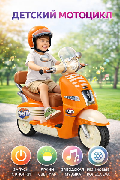 Название: Детский электроскутер , бренд Adil Original (Китай) \ Описание: Яркий, стильный и мощный скутер с двумя моторами! Подходит для активных и модных малышей от 2 до 6 лет. Оснащён удобным кожаным сиденьем и устойчивыми колёсами для комфортного управления. Дизайн с надписями Fanta, Sprite, Red Cola подчёркивает индивидуальность маленького гонщика. Характеристики: 2 мотора — отличная тяга и скорость Кожаное сиденье Яркий дизайн с надписями Fanta, Sprite, Red Cola Устойчивые колёса Возраст: 2–6 лет Цвета: оранжевый, зелёный, красный Преимущества: Отличный подарок для маленьких гонщиков Мощность и стиль в одном Безопасность и комфорт
