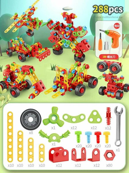 В комплект входит 288 деталей различных форм и цветов, крепёжные элементы, а также удобный электрошуруповёрт, работающий от батареек. Благодаря инструменту сборка становится проще и интереснее — ребёнок чувствует себя настоящим мастером.