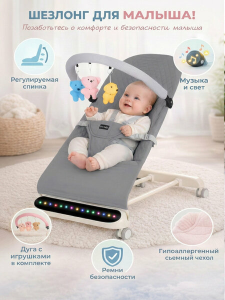 Кресло-качалка обеспечивает мягкие покачивания и комфортную поддержку для малышей. Конструкция рассчитана на максимальную нагрузку до 15 кг, что гарантирует надёжность и безопасность при ежедневном использовании. Кресло подходит как для укачивания, так и для отдыха. Плавные покачивания помогают малышу расслабиться, успокоиться и быстрее заснуть, а удобная посадка поддерживает правильное положение тела. Для детей от 0 до 6 месяцев кресло используется как колыбель для сна, от 6 до 12 месяцев — как обучающее кресло с защитой от падения. Спинка регулируется в трёх положениях: 110° — лёжа, 135° — полулёжа, 150° — сидя. Съёмная дуга позволяет легко переходить от сна к игре или кормлению. Встроенные мелодии помогают успокоить и развлечь ребёнка. Модели укомплектованы подвесными игрушками и игровой дугой, которые развивают зрительное восприятие, мелкую моторику и интерес к окружающему миру. Кресло оснащено колёсиками, благодаря которым его легко перемещать по дому, не беспокоя спящего малыша. Качественные материалы, устойчивая металлическая конструкция и мягкая подушка обеспечивают комфорт и долговечность. Кресло представлено в стильных расцветках: серый, розовый, голубой и коричневый. Функциональность, безопасность и продуманные детали делают это кресло-качалку отличным выбором для дома и в качестве подарка. Лёгкий корпус можно поднять одной рукой, а в сложенном виде кресло занимает всего около 0,2 м². Оно удобно для использования дома, на прогулках и в гостях, помогая родителям забыть о «прилипчивой» тревоге и сделать уход за ребёнком более спокойным и комфортным.