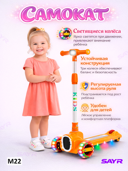 Детский самокат со световыми и музыкальными эффектами — это современное и удобное средство передвижения, созданное для активных прогулок, развития координации и получения ярких эмоций. Данная модель сочетает в себе привлекательный дизайн, продуманную конструкцию и функциональные возможности, которые делают катание комфортным и безопасным для ребёнка. Самокат отлично подойдёт для ежедневного использования на улице, во дворе, в парке или на прогулочных дорожках. Одной из главных особенностей самоката является регулируемая высота руля. Модель оснащена системой из трёх уровней регулировки, что позволяет легко настроить самокат под рост ребёнка. Благодаря этому самокат может использоваться в течение длительного времени и «расти» вместе с ребёнком, сохраняя удобство и правильную посадку. Надёжный механизм фиксации обеспечивает устойчивость руля во время катания. Мягкие гелевые колёса со встроенной подсветкой обеспечивают плавный и тихий ход. Во время движения колёса ярко светятся, создавая эффектный визуальный образ, который особенно нравится детям. Светящиеся элементы не только делают катание более интересным, но и повышают заметность ребёнка в условиях недостаточного освещения, что положительно сказывается на безопасности. Самокат оснащён свето-музыкальными эффектами, которые активируются во время движения. Подсветка деки и колёс, а также музыкальное сопровождение превращают обычную прогулку в увлекательное приключение. Такие функции стимулируют интерес ребёнка к активному отдыху и мотивируют проводить больше времени на свежем воздухе, развивая физическую активность.
