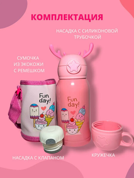 - "Детский термос "Deer" с защитным чехлом на лямках, крышкой-кружкой и силиконовой трубочкой - это идеальный выбор для детей, предлагающий удобство, безопасность и веселое питье в любом месте и в любое время. - 550 мл. Детские термосы подходят для детей, подростков. Вакуумно-герметичная конструкция сделала изоляцию более эффективной, сохраняя тепло до 12 часов и холод более 24 часов. - Эта бутылка для воды полностью устойчива к окислению и коррозии. Кроме того, напиток можно сохранить с его оригинальным вкусом. - Кроме того, напиток можно сохранить с его оригинальным вкусом. Эта многоразовая бутылка для воды, не содержащая бисфенола А, не содержит полимеров, пластификаторов и других синтетических элементов. - Термос для детей изготовлен из медицинской нержавеющей стали марки 316, сильно отличающейся от обычной нержавеющей стали 18/8. - Бутылка с двойными стенками изготовлена из нержавеющей стали. В комплект входит чехол-сумочка с удобным регулируемым ремешком; кружечка для воды; пробка для термоса с клапаном налива, крышка для термокружки с трубочкой. Многофункциональный термос-термокружка объемом 550 мл можно использовать как бутылку для разнообразных напитков, как термос или термокружку для горячих напитков. Бутылка с двойными стенками изготовлена из нержавеющей стали. В комплект входит чехол-сумочка с удобным регулируемым ремешком; кружечка для воды; пробка для термоса с клапаном налива, крышка для термокружки с трубочкой. Бутылка изготовлена из высококачественных материалов, которые полностью безопасны для здоровья. Термокружка сохраняет тепло до 8 часов, холод до 12 часов. Продуманная конструкция делает термос долговечным и удобным в использовании. Термокружка легко разбирается, а широкое горлышко обеспечивает легкий доступ при мытье. Перед первым использованием изделие необходимо тщательно вымыть теплой водой.