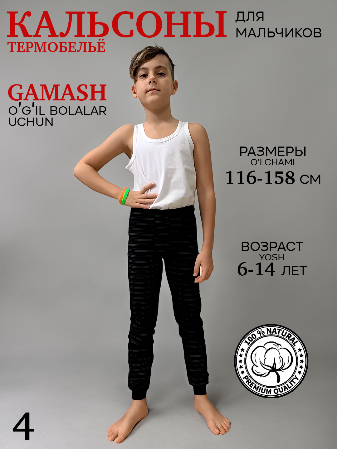 1. Кальсоны для мальчика, изготовленные из качественного узбекского хлопка. Модель предназначена для повседневной носки в прохладную погоду. Оригинальная технология вязания и исключительно мягкая однородная пряжа позволяют сохранять тепло, создают повышенный комфорт. Плоские швы повышают прочность и создают дополнительное удобство при носке. При покупке старайтесь брать размер чуть больше , Т. К. Данная модель немного маломерит. Модель предназначена для повседневной носки из 100% Узбекского хлопка в прохладную и холодную погоду. Прекрасно подходят для активного отдыха. Оригинальная технология вязания и исключительно мягкая однородная пряжа позволяют сохранить тепло, создают повышенный комфорт. Плоские швы повышают прочность и создают дополнительное удобство в носке. 100% хлопок 2. Кальсоны однотонные, выполнены из хлопкового полотна с эластичными манжетами. Модель предназначена для повседневной носки в прохладную погоду. Технология вязания и однородная пряжа позволяют сохранять тепло, создают комфортные ощущения при носки. Плоские швы повышают прочность и создают дополнительное удобство при носке. Классические цвета и полное облегание, позволят носить кальсоны под любыми брюками или джинсами. Бережная стирка при t не более 40С, Состав: хлопок 95% эластан 5%. 3. Детские и подростковые кальсоны без начеса от бренда T-SOD никого не оставят равнодушными. Кальсоны для мальчика изготовленные из качественного 95% хлопка. Модель предназначена для повседневной носки в прохладную погоду. Оригинальная технология вязания и исключительно мягкая однородная пряжа позволяют сохранять тепло, создают повышенный комфорт. Кальсоны не сковывают движения. Базовое белье можно надевать под костюм или комбинезон в школу, в детский сад зимой, весной и осенью. Это самый подходящий вид нижнего нательного белья для мальчика в прохладную погоду. При подборе ориентируйтесь на нижний размерный ряд, т. к. модель маломерит. Бережная стирка при t не более 40С, Состав: хлопок 95% эластан 5%. 4. Ультрамягкие детские кальсоны. Не сковывают движений. Сохраняют тепло и согревают тело. Специальная ткань выводит влагу, оставаясь сухой. Эффектный дизайн в полоску, идеальное облегание фигуры и абсолютная свобода движений благодаря высокой эластичности полотна. Наше термобелье подходит для ежедневной носки, активных занятий спортом и прогулок. Комбинированное полотно из натуральных и синтетических волокон дарит вам комфорт даже при активных физических нагрузках. Большой размерный ряд бережная стирка при 30 градусах, Состав: 80% хлопок 20% полиэстер. 5. Термокальсоны - незаменимая часть гардероба каждого ребенка. Кальсоны надевают вторым слоем под вещи, собираясь на прогулку зимой, холодной весной и осенью. Термобрюки подходят для активного отдыха. Термолосины надевают под лыжный или хоккейный костюм, собираясь на каток или хоккей. Они согреют во время катания на горных лыжах или сноуборде, прекрасно сохраняют тепло и подходят для велоспорта, бега и беговых занятий и игры в футбол на улице. Леггинсы подходят и девочкам и мальчикам. В наличие детские и подростковые размеры. У нас есть акции и распродажи, вы можете купить наши товары в подарок со скидкой! Такая поддева отлично подойдёт для школы, для садика, занятий спортом и повседневного использования, как домашнее трико