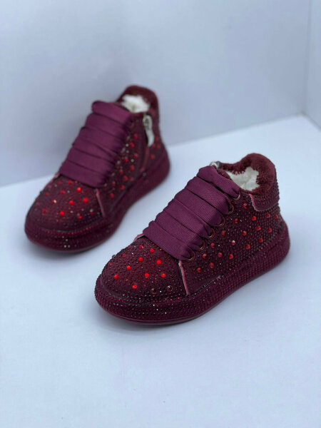 Эти детские утеплённые кеды — хороший выбор для повседневной носки в прохладный сезон. Верх украшен большим количеством страз, которые красиво блестят и делают модель яркой и нарядной. Внутри — мягкий тёплый мех, обеспечивающий комфорт и тепло ребёнку. Кеды оснащены широкой декоративной шнуровкой, а сбоку расположена молния — благодаря этому обувь легко надевать и снимать. Лёгкая и гибкая подошва обеспечивает комфорт при ходьбе, а уплотнённый носок помогает защитить стопу. Подходят для сада, школы, прогулок и ежедневного использования.