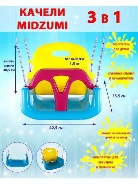 Детские пластиковые качели 3в1 Midzumi - это многофункциональная игрушка, которая подарит вашему ребенку яркие впечатления и активный отдых. Качели выполнены из прочного пластика, который выдерживает интенсивное использование и легок в уходе. Благодаря спинке, качели обеспечивают удобство и безопасность, поддерживая ребенка во время игры. Подвесной элемент легко регулируется, что позволяет адаптировать его под рост и возраст ребенка. Три различных варианта для разного возраста: №1 со спинкой и ограничителем (от 1 до 3-х лет), №2 со спинкой и без ограничителя (от 3 до 5 лет), №3 без спинки и без ограничителя (от 5 лет и старше). Габаритные размеры (ДхШхВ): 35,5 x 42,5 x 150 см. Максимальная допустимая нагрузка: 100 кг. Вес нетто: 1,5 кг. Цвет товара: голубой/желтый/малиновый. Детские пластиковые качели 3в1 Midzumi - отличный выбор для активного и безопасного отдыха вашего ребенка.