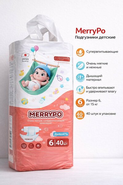 Детские подгузники MerryPo – это высококачественные одноразовые подгузники, созданные специально для малышей. Они обеспечивают комфорт и защиту для вашего ребенка, делая его сон и игры беззаботными. Особенностью этих подгузников является уникальная технология «трех дышащих слоев». Благодаря этому, кожа ребенка остается сухой и здоровой, без раздражений и опрелостей. Микропоры выводят прелый воздух, предотвращая перегрев, а супервпитывающий полимер превращает жидкость в гель, обеспечивая защиту от протеканий даже ночью. Подгузники MerryPo обладают исключительной мягкостью. Нежная внутренняя поверхность приятна на ощупь и не натирает кожу малыша. Индикатор влаги на подгузниках меняет цвет, когда приходит время сменить подгузник. Это помогает родителям всегда быть в курсе, когда пора менять подгузник, и обеспечивает своевременную смену. Эластичные многоразовые липучки обеспечивают комфорт при активных движениях, а также идеальную посадку. В одной упаковке содержится большое количество подгузников, что позволяет использовать их на протяжении длительного времени. Выбирая детские подгузники MerryPo, вы делаете ставку на качество, комфорт и безопасность для своего малыша.