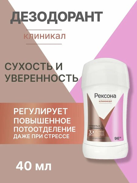 Описание Рексона, Антиперспирант-стик, Сухость и уверенность, 40 мл. Для тех, кому нужна беспрецедентная защита от пота и неприятного запаха, чтобы быть уверенным в каждом дне и быть готовым ко всему, Рексона представляет новое поколение антиперспирантов Рексона Клиникал Protection. Все люди потеют. Некоторые из нас потеют больше, чем другие. Некоторые потеют более обильно в определенных ситуациях, которые могут быть непредвиденными, что вызывает дискомфорт и стеснение. Чтобы регулировать повышенное потоотделение и помогать вам оставаться сухим и свежим даже при стрессе, Рексона разработала революционную технологию совершенной защиты Defence+, которая образует микропленку на поверхности кожи, обеспечивая 96 часов непрерывной защиты от пота и запаха. Защита в 3 раза эффективнее базового антиперспиранта. Максимальная защита даже в экстремальных ситуациях (стресс, жара, спорт). Сухость надолго!